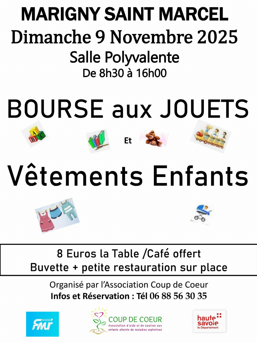 Le dimanche 09 novembre 2025 de 8h30 à 16h, la salle polyvalente de Marigny-Saint-Marcel accueillera une bourse aux jouets et vêtements pour enfants. C'est l'occasion idéale pour renouveler les trésors de vos petits à petit prix !