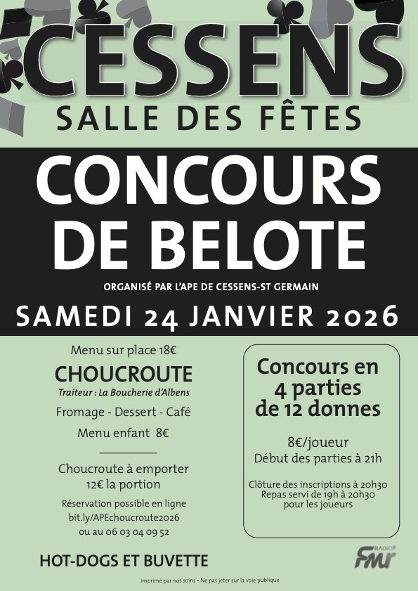 L'APE de Cessens-St-Germain organise son concours de belote ce samedi 24 janvier dans la salle des fêtes de Cessens (Entrelacs).