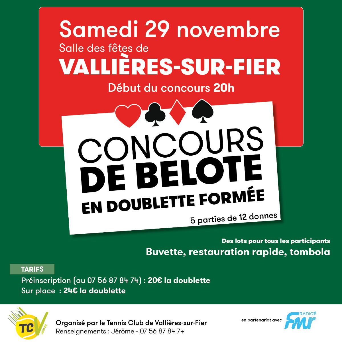Tous les événements et sorties TweetLa salle des fêtes du centre de Vallières-sur-Fier accueille deux concours de belote organisés par le Tennis Club de Vallières-sur-Fier.