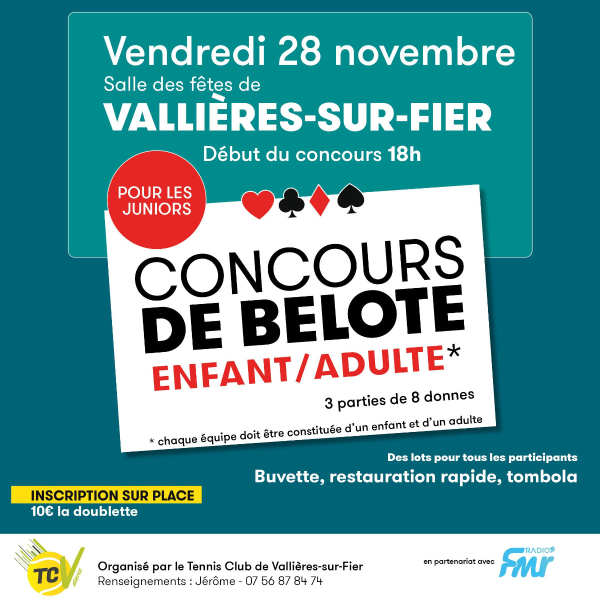 Tous les événements et sorties TweetLa salle des fêtes du centre de Vallières-sur-Fier accueille deux concours de belote organisés par le Tennis Club de Vallières-sur-Fier.