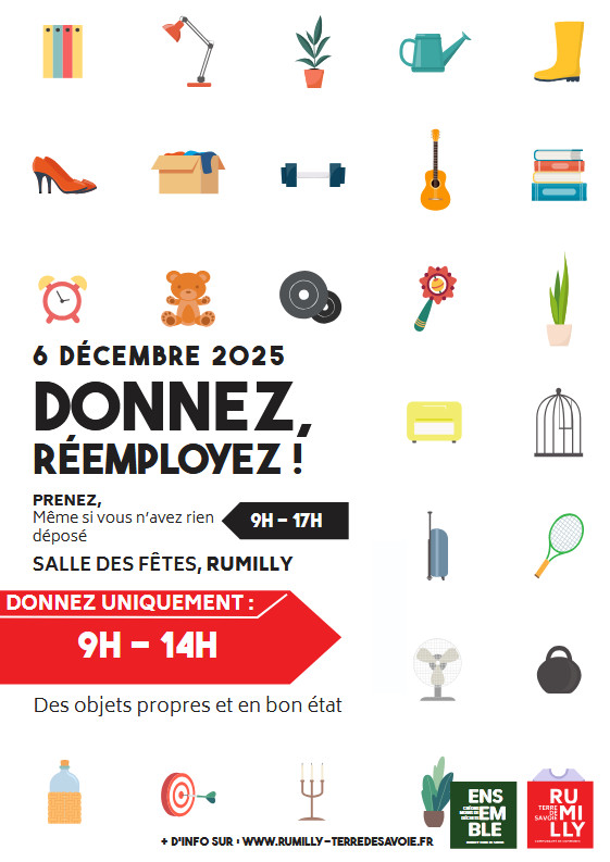 Le service Prévention et valorisation des déchets de la Communauté de communes Rumilly Terre de Savoie organise la 11e édition de la journée « Donnez, réemployez ! », un événement autrefois connu sous le nom de « zone de gratuité ». L’objectif est simple : offrir une seconde vie à des objets propres et en bon état, en favorisant le réemploi plutôt que la production de déchets.