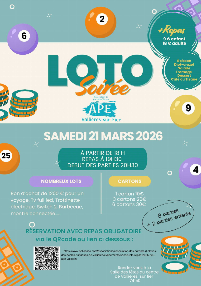 L’Association des Parents d’Élèves des écoles publiques de Vallières-sur-Fier organise une soirée loto exceptionnelle le samedi 21 mars 2026 à la salle des fêtes du centre de Vallières-sur-Fier.