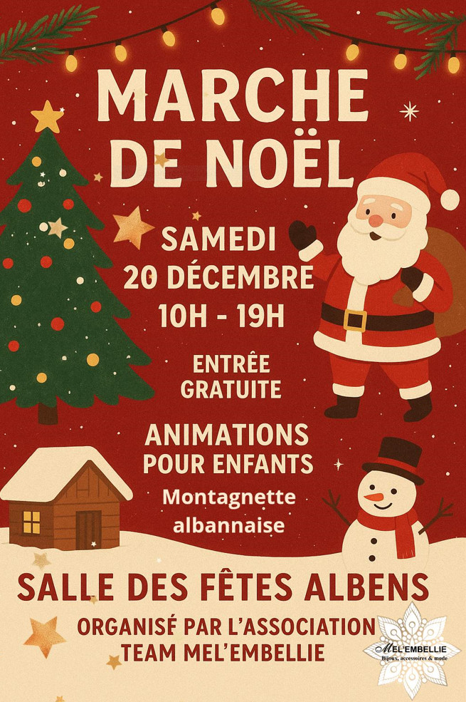 La magie de Noël s’invite à Albens le samedi 20 décembre, à la salle des fêtes, avec un marché organisé par la Team Mel’Embellie et l’APE d’Albens. De 10h à 19h, petits et grands pourront profiter d’un événement chaleureux mêlant gourmandise, artisanat local et animations festives.