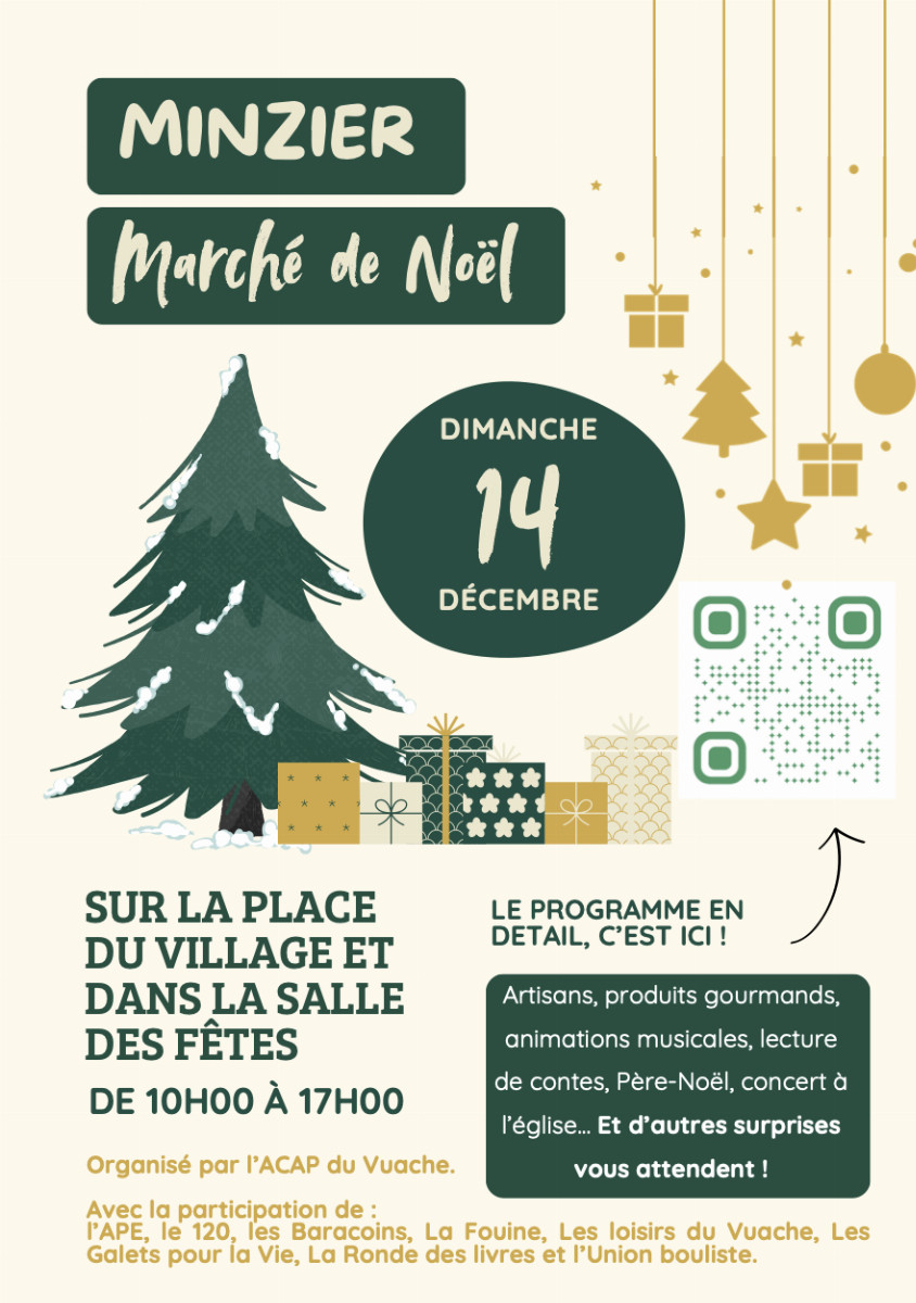 Tous les événements et sorties TweetLe village de Minzier s’apprête à vivre une journée festive ce dimanche 14 décembre, à l’occasion de son traditionnel marché de Noël, organisé par l’Association des Commerçants, Artisans et Producteurs du Vuache (ACAP du Vuache).
