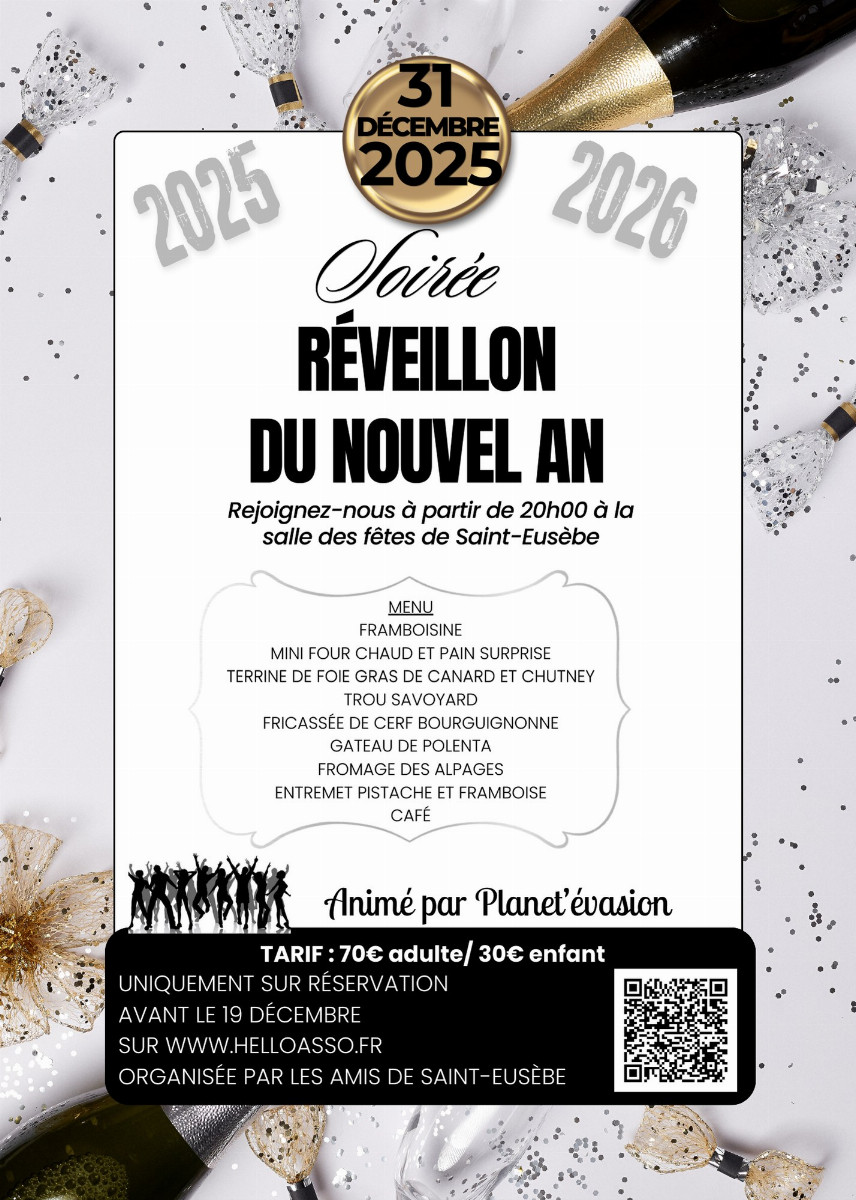 Ce mercredi 31 décembre, les Amis de Saint Eusèbe vous propose une soirée réveillon du nouvel an !
