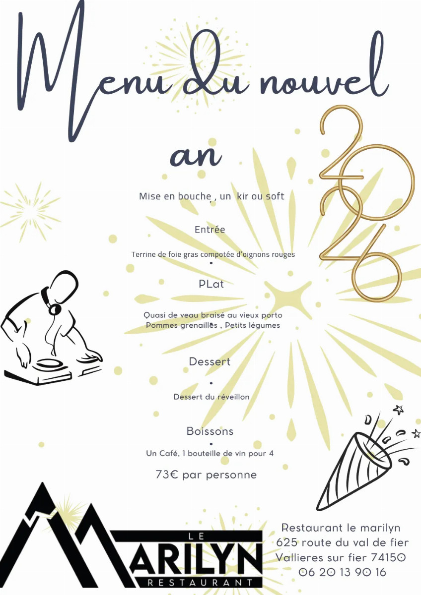 Le restaurant Le Marilyn à Vallières-sur-Fier vous invite à célébrer le passage à la nouvelle année lors d’une grande soirée dansante accompagnée d’un menu festif spécialement préparé pour l’occasion !