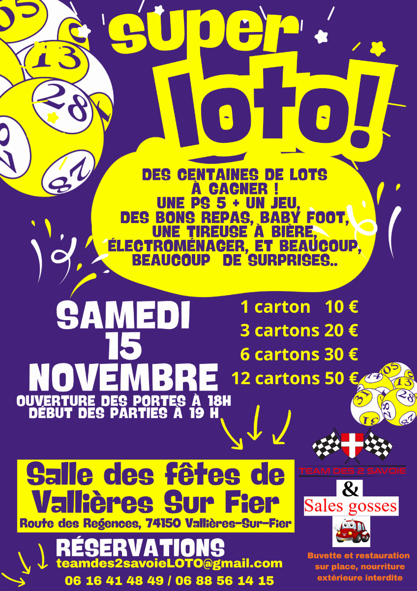 Le samedi 15 novembre, la Team des 2 Savoie et les Sales Gosses organisent un Super Loto à la salle des fêtes de Vallières-sur-Fier.Les portes ouvriront dès 18h, et le début des parties est prévu à 19h.