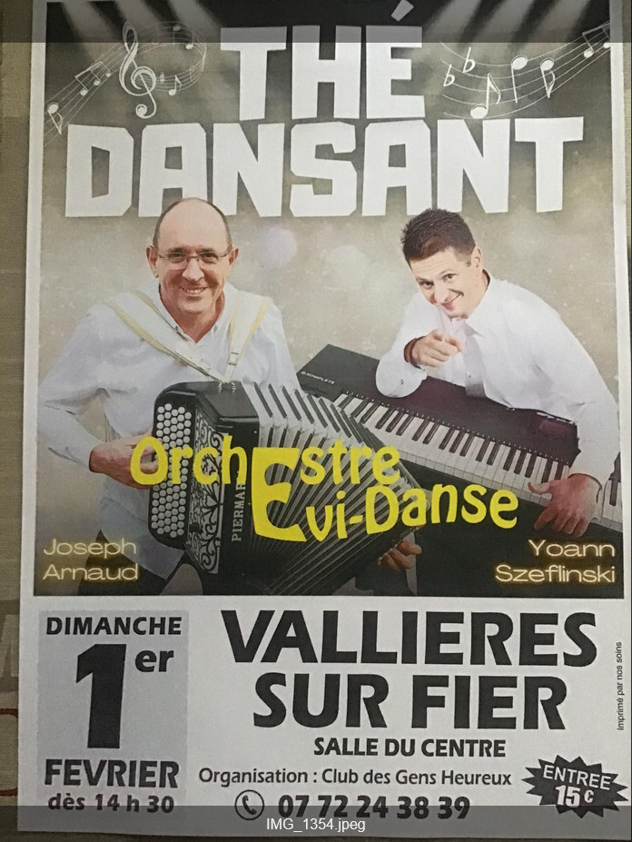 Le thé dansant aura lieu dans la salle du centre de Vallières-sur-Fier avec l'orchestre Evi-danse !