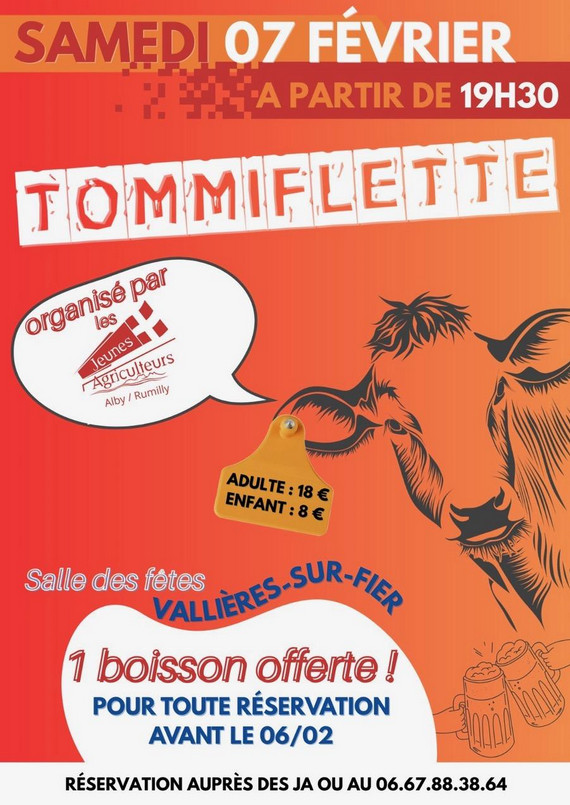 Les Jeunes Agriculteurs Alby / Rumilly donnent rendez-vous au public le samedi 7 février, à partir de 19h30, à la salle des fêtes de Vallières-sur-Fier, pour une soirée conviviale et gourmande : la Tommiflette.
