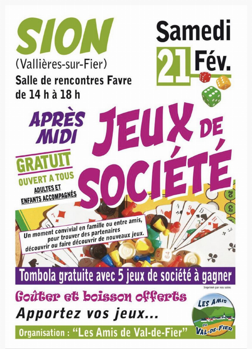 Avis aux amateurs de jeux et aux curieux : une après-midi jeux de société est organisée le samedi 21 février, de 14h à 18h, à la salle de rencontres Favre à Vallières-sur-Fier.